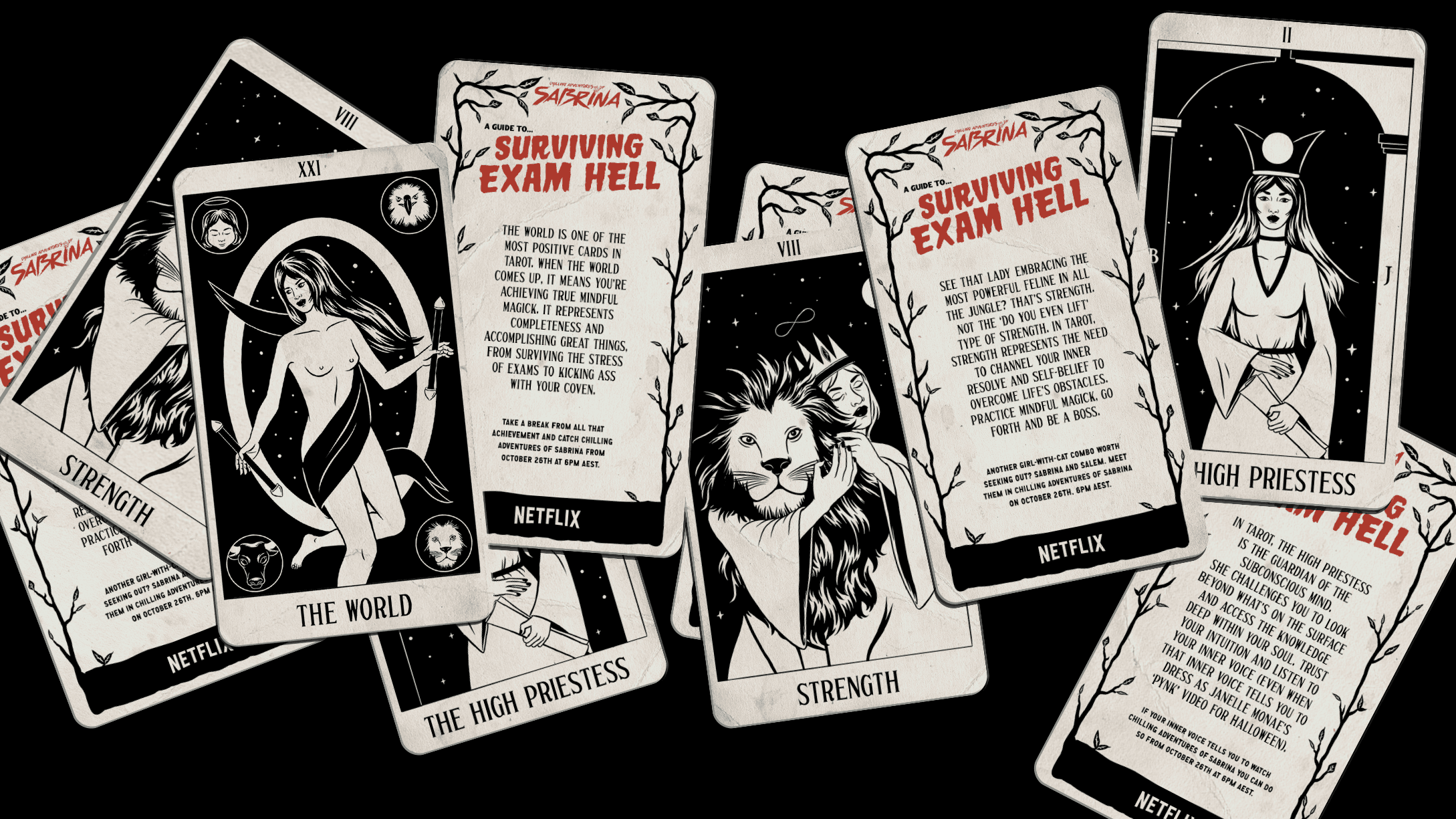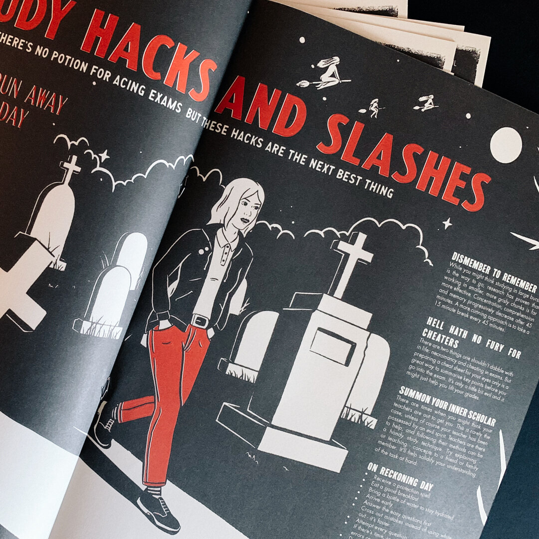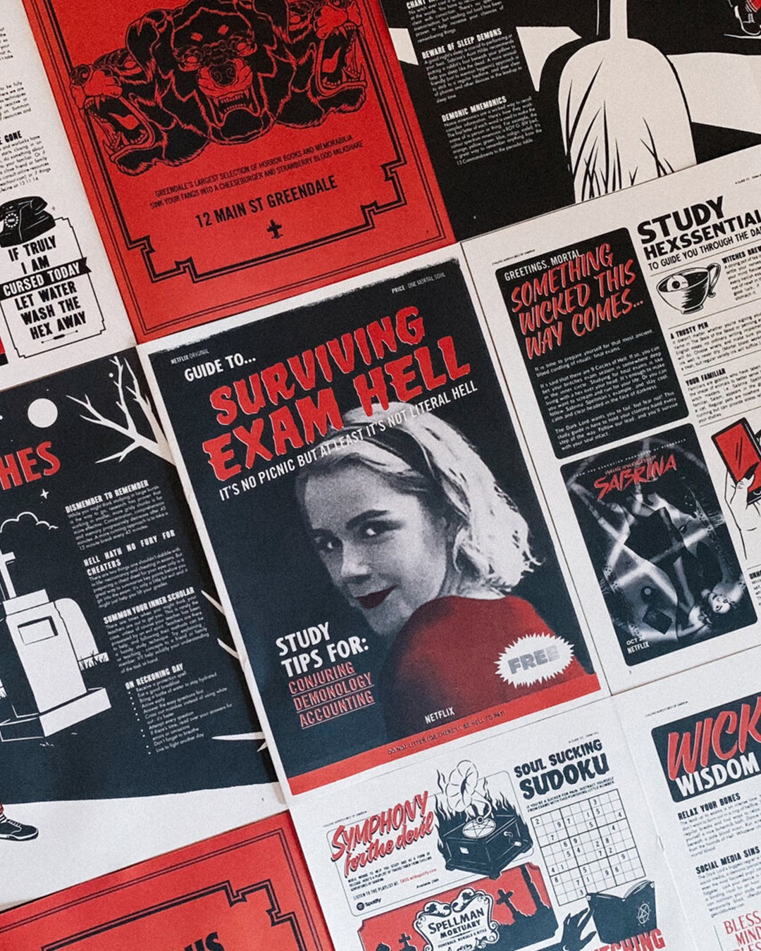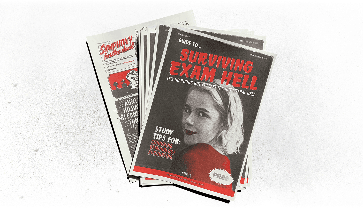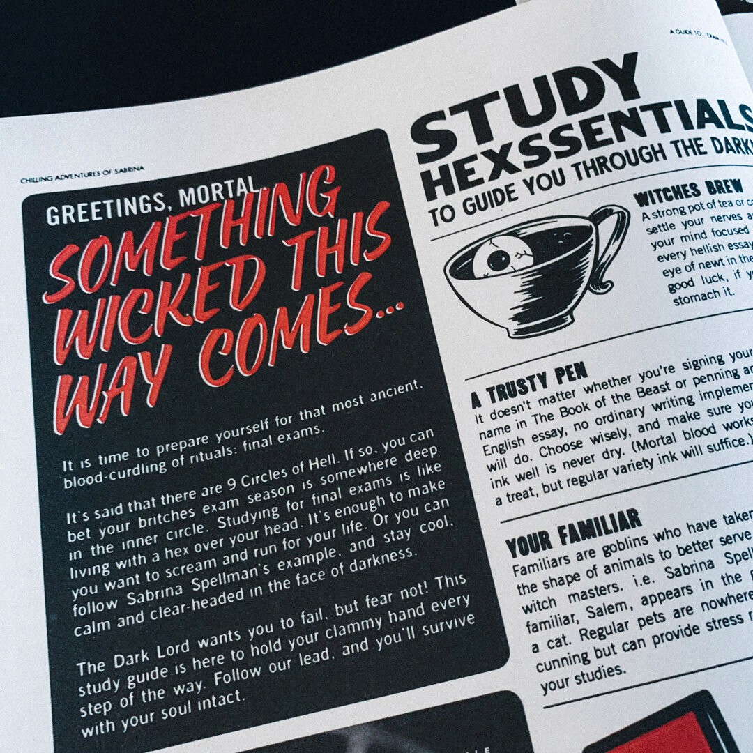 Netflix’s Chilling Adventures of Sabrina is a supernatural teen drama. It launched in October 2018, a time when its teen audience were facing their own hell: school exams. To help see them through and get ‘Brina on to-watch lists, we created a study guide in the style of the show. The guide was printed as a free newspaper and was also featured on youth websites and social.